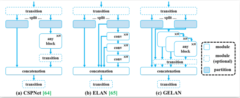 在这一部分中,我们描述了提出的新网络架构 - GELAN。通过结合两种神经网络架构,即带有梯度路径规划的 CSPNet 和 ELAN,我们设计了考虑轻量化、推理速度和准确性的广义高效层聚合网络(GELAN)。其整体架构如图 4 所示。我们将 ELAN 的能力进行了泛化,原本只使用卷积层堆叠的 ELAN,可以使用任何计算块的新架构。