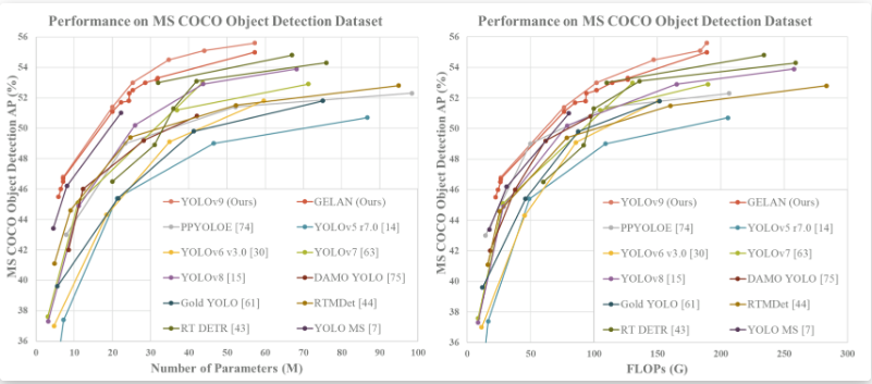 YOLO v9 提出了可编程梯度信息(PGI)的概念,设计了新的网络架构(GELAN),结果显示二者对于检测性能提升和参数利用率提升都发挥了重要作用。