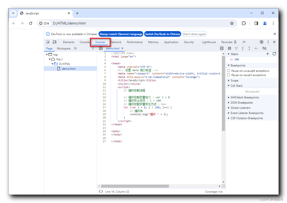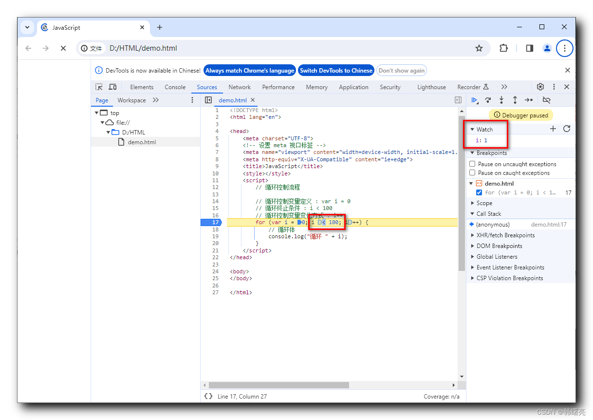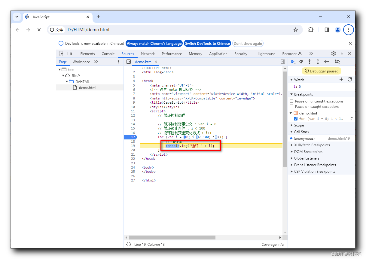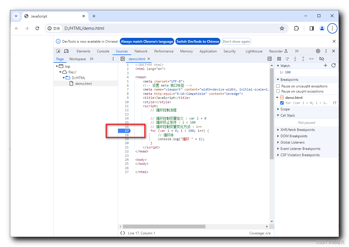 代码阻塞在 console.log("循环 " + i); 循环体代码的第一行位置 ;