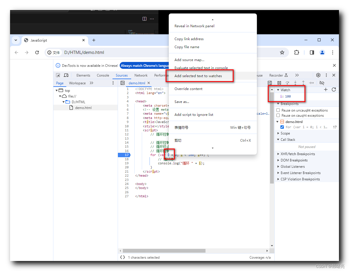 选中 指定的表达式 , 这里选择 i 变量 , 然后点击右键 , 在弹出的右键菜单中 , 选择 " Add selected text to watches " 选项 , 就可以在右侧 " Watch " 中查看选中的表达式 ;