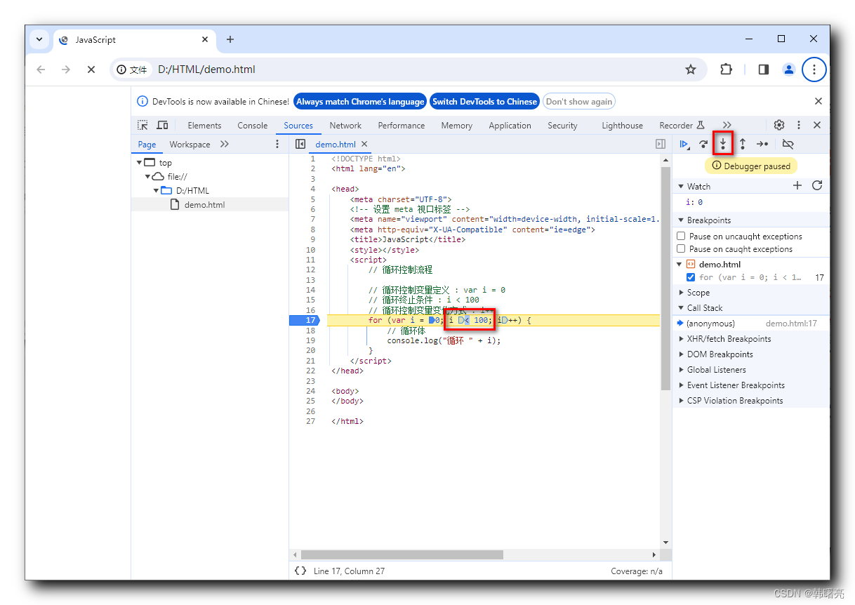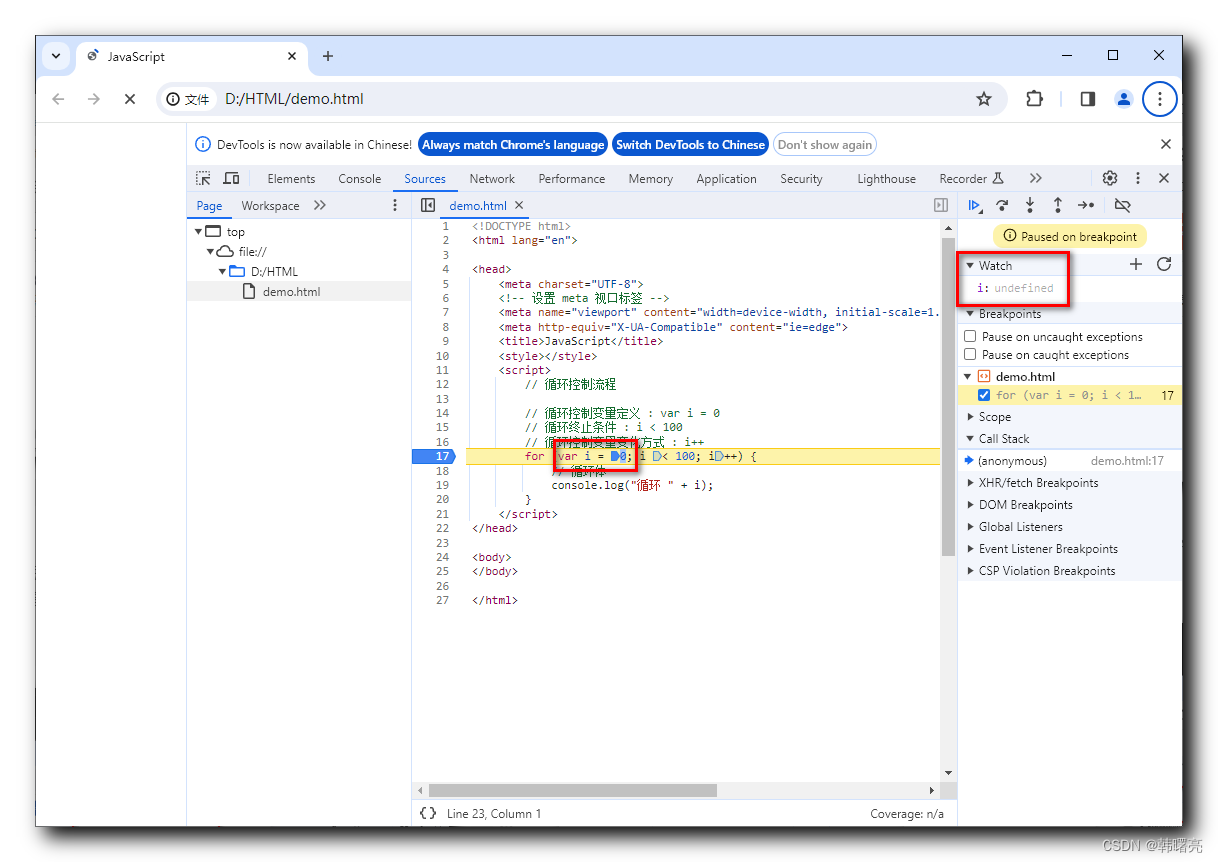 刷新界面 , 进入断点 , 阻塞 , 此时 var i = 0; 代码还未执行 , i 的值为 undefined 未定义值 ;