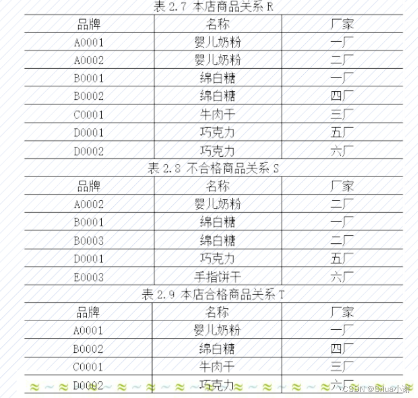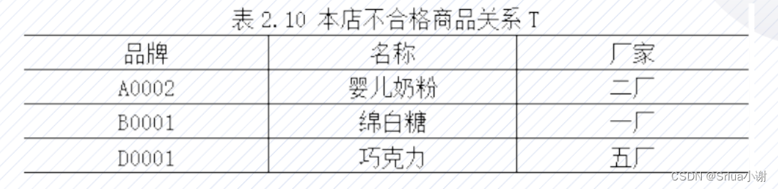 例题 2.3 在上例中,若要找出本店内不合格的商品关系T,则关系T由既属于本店商品关系 R 又属于不合格商品关系S的元组组成(即为集合交运算),并且得到的关系T仍然有三个属性(品牌,名称,厂家)。