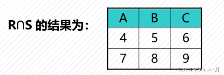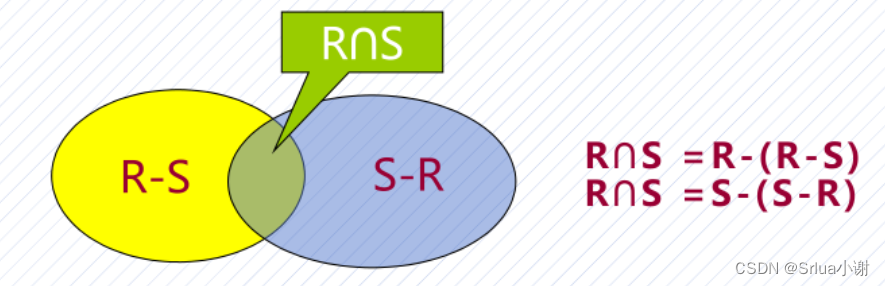 其结果关系仍为n目关系,由既属于R又属于S的元组组成。关系的交运算可以用差运算来表示,即R