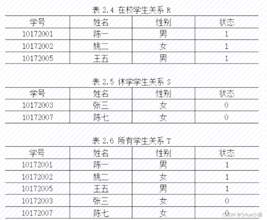 例题 2.1 在校学生关系 R 和休学学生关系 S,其中关系 R 与关系 S 都有四个属性(学号,姓名,性别,状态),若要取得所有学生关系T,则关系T由属于在校学生关系 R和休学学生关系S的所有元组组成(即为集合并运算),并且得到的关系T仍然有四个属性(学号,姓名,性别,状态)。