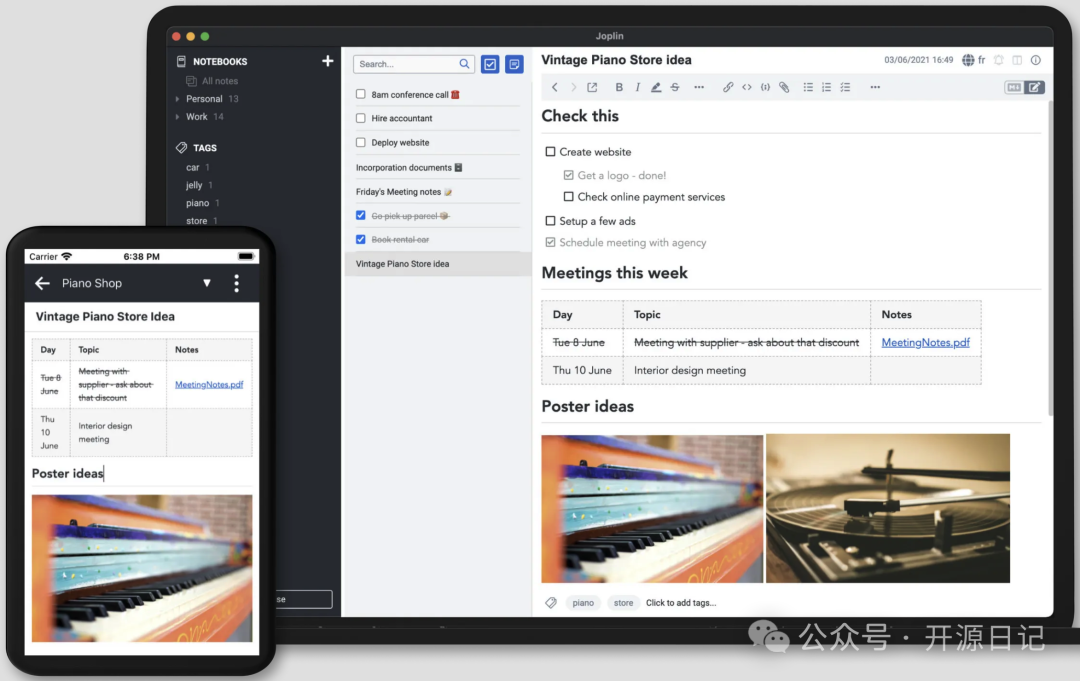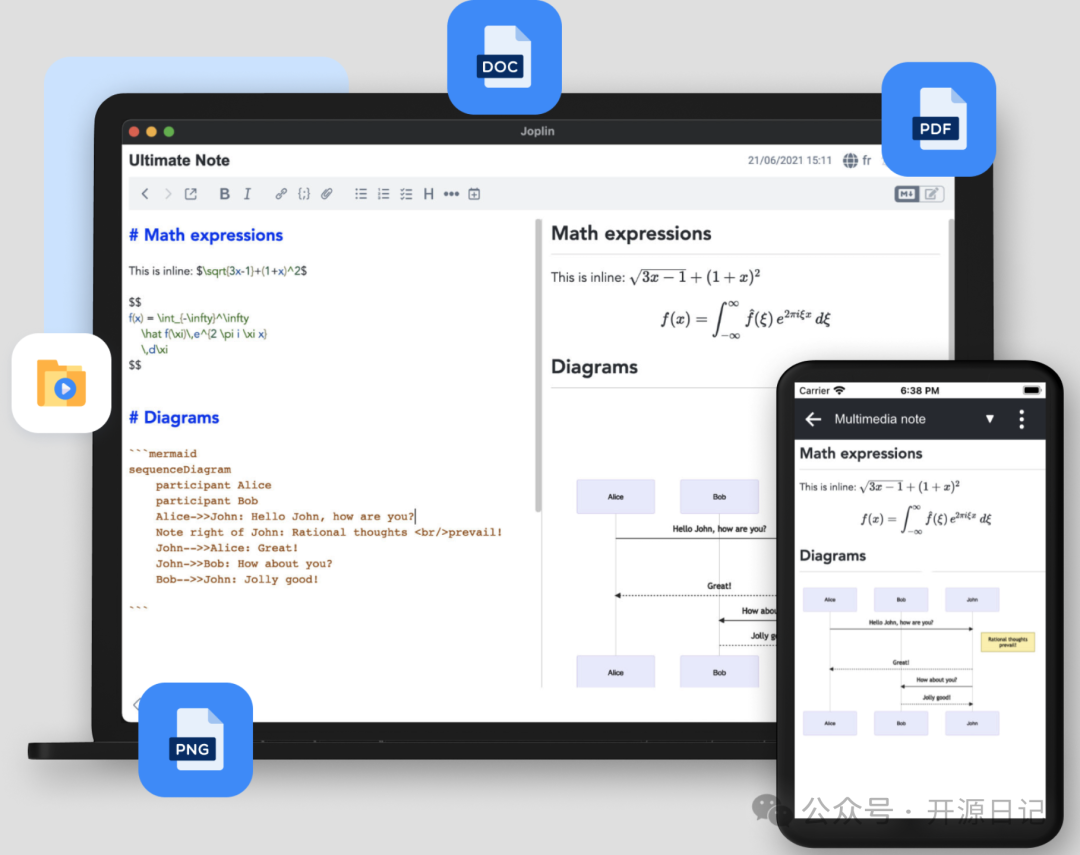 Joplin 可以让用户高效地创建、编辑和组织笔记。用户可以轻松搜索、添加标签、复制和修改笔记在应用程序内部或通过外部文本编辑器。所有笔记以 Markdown 格式存储,确保对于喜欢结构化文本内容的用户具有兼容性和灵活性。
