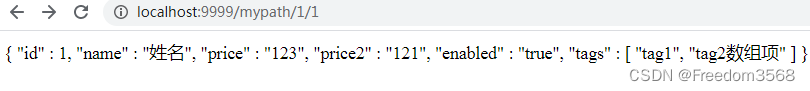 ${type<=>abc}的表达式。也可以使用正则:{id<=>:[A-Z0-9\-]+},含义是任意字符。具体可参考数据库里的例子 ● query_string_parameters: 当GET类型时的地址栏query_string参数,比如{pid:1},{type:abc} ● req_cookie: cookie集合,map类型,不需要双括号,如{Session:97d43b1e-fe03-4855-926a-f448eddac32f},{…} ● req_headers: head集合,map类型, {Content-Type:text/html;charset=utf-8},{other:othervalue} ● req_jsonbody: 请求body,支持json和string ● resp_statuscode: 默认200 ● resp_cookie: 类似req_cookie,map类型 ● resp_headers: 类似req_headers,map类型 ● resp_body: 响应body,支持json和string,如{ “id” : 1, “name” : “姓名”, “price” : “123”, “price2” : “121”, “enabled” : “true”, “tags” : [ “tag1”, “tag2数组项” ] } 配置完成后提交数据,进入实例对应的路径测试:如: http://localhost:7821/mypath/1/eee