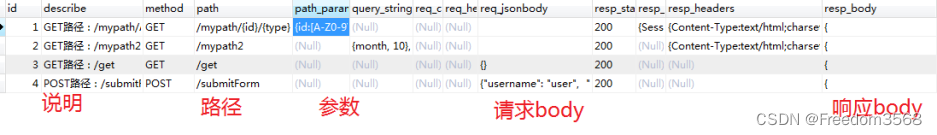 使用方法: 还没有操作录入界面,在数据库中直接注入数据即可(数据提交后,实例大约30秒之内注册到mock服务),数据行对应的是Mock实例。 字段说明: ● id: 自增 ● describe: 说明 ● method: 请求类型,GET、POST、DELETE ● path: 路径,比如/mypath/{id}/{type} ● path_parameters: 路径参数,因为有可能存在json等格式字符,不便于使用=,等分隔字符(因为要组装参数数组),所以参数之间使用特殊字符分隔($