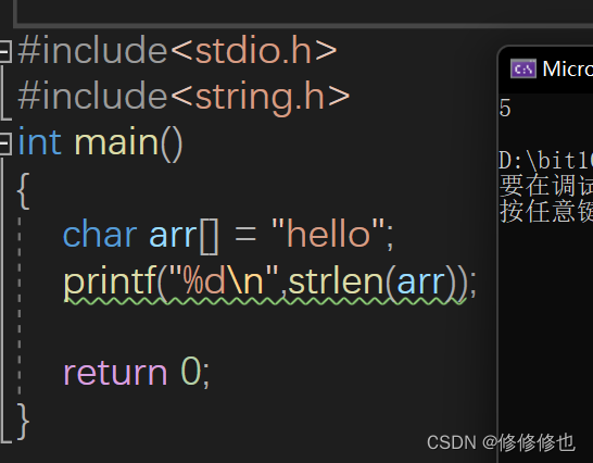 }上述代码就是一个简单的使用strlen函数求字符串长度的案例,同时我们并没有定义数组的大小,放在编译器中的调试结果为5。