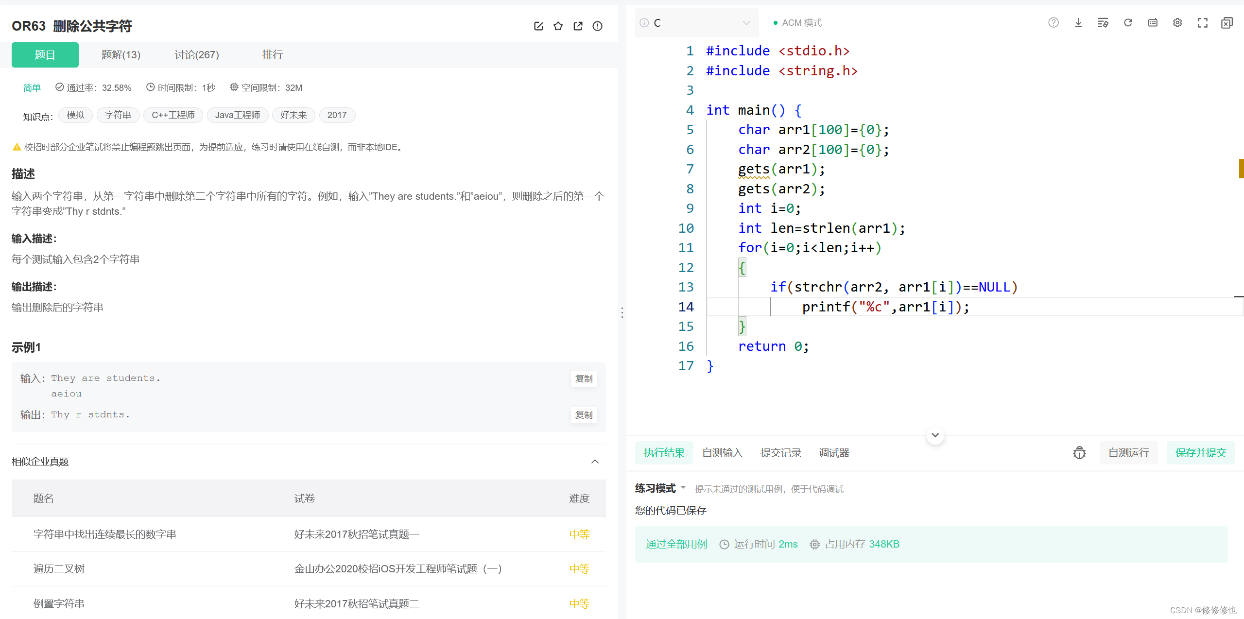 然后,在打印的过程中判断该字符是否属于第二个字符串,