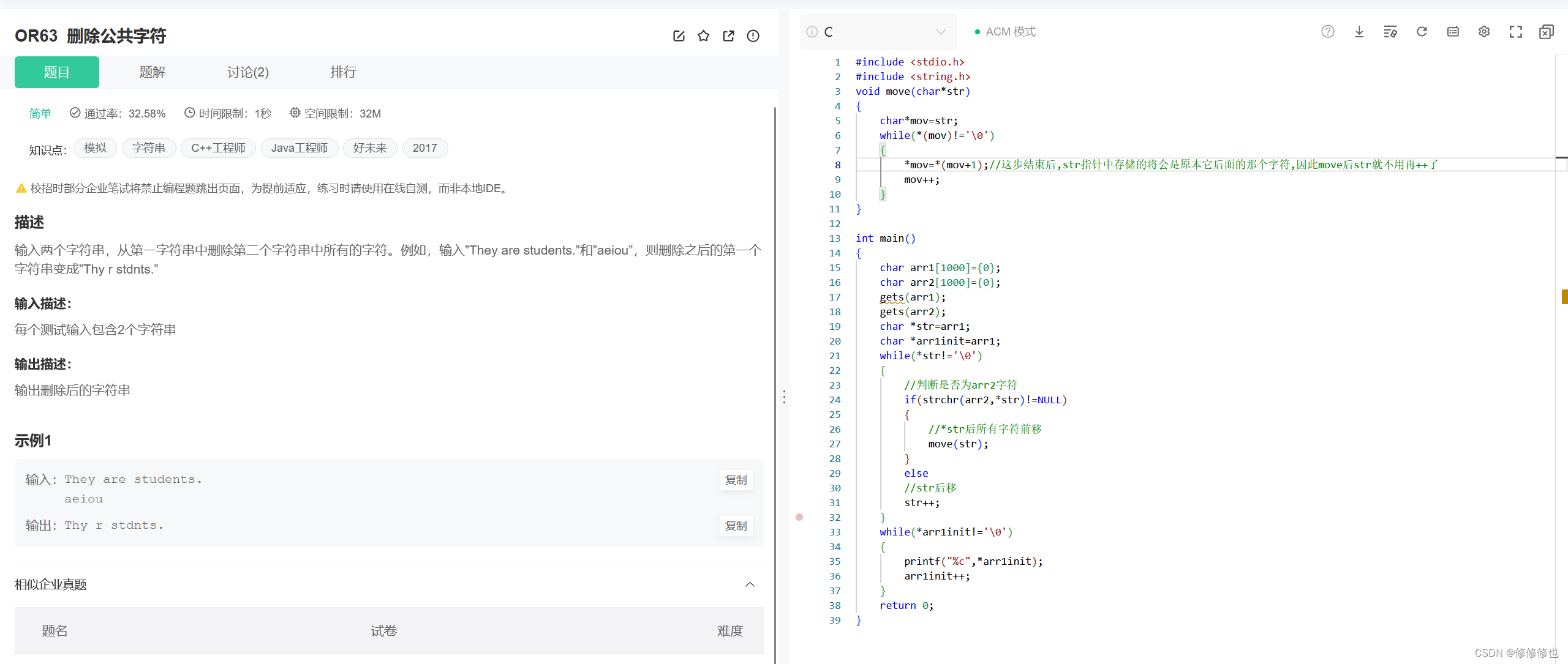 如果检查出该指针指向的字符属于arr2,则将*str后的字符逐一向前提一个字节.