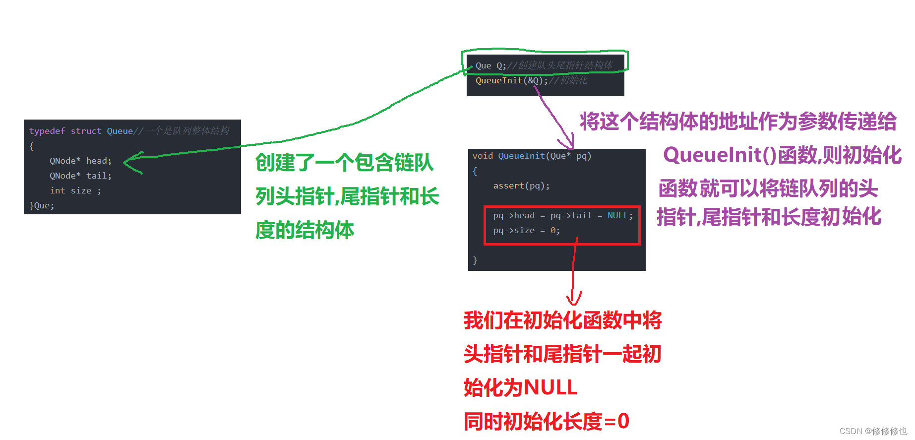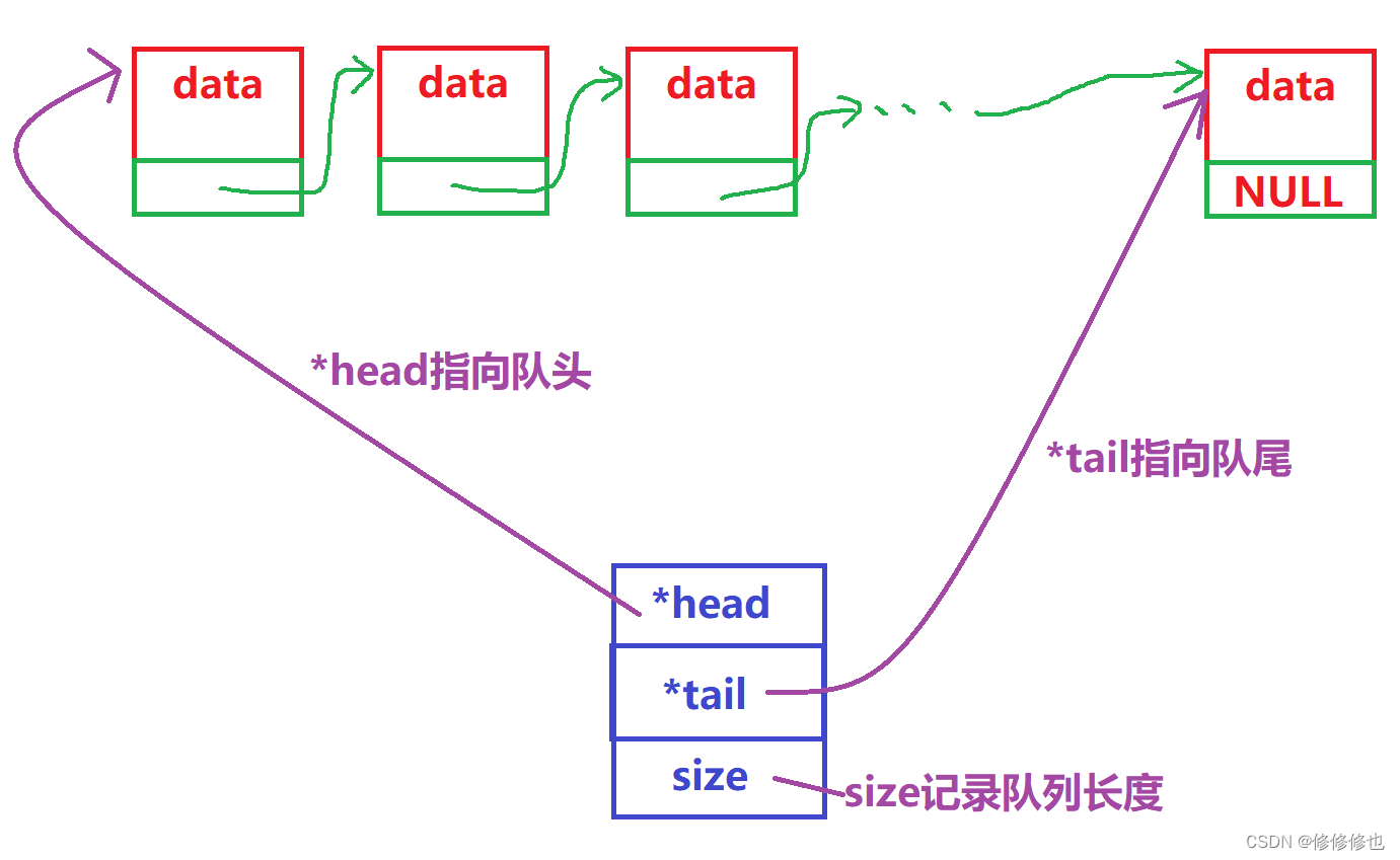}Que;回忆我们在链表部分对链表的初始化仅仅是将头指针置为NULL.而到了链队列这里,我们还多出两个需要处理的变量,一个是尾指针tail,一个是链队列长度size.