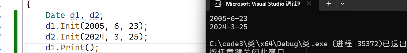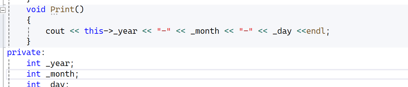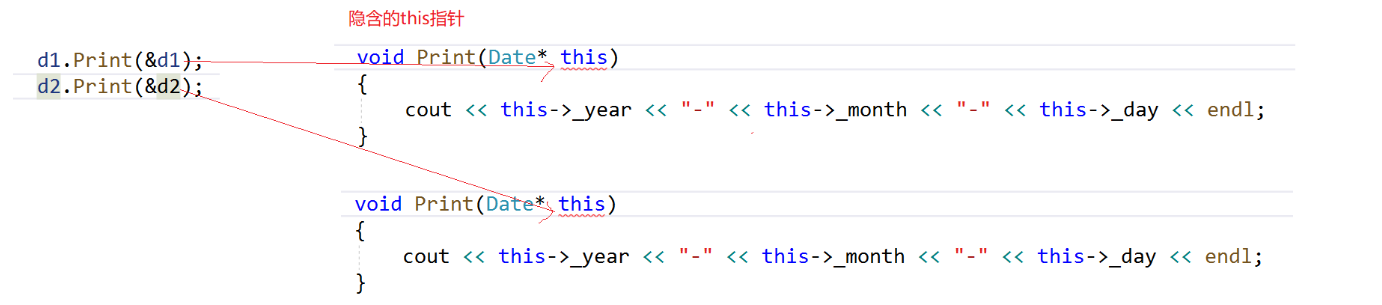 Print()通过this指针(隐式指向当前对象)访问这些成员变量时,它实际上访问的是调用这个成员函数的那个==特定对象(实例)==的成员变量。每个对象的_year、_month和_day都存储在各自独立的内存区域中,这些内存区域是在对象被创建时随对象一起分配的