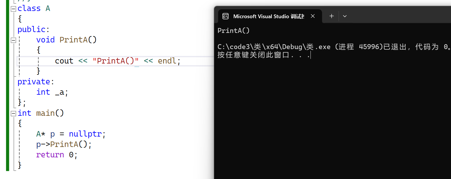 因为PrintA()不访问对象的任何成员变量,所以这个调用在技术上不需要访问通过this指针指示的内存地址。因此,对于这种不访问任何成员变量的成员函数,通过nullptr调用可能不会导致运行时错误