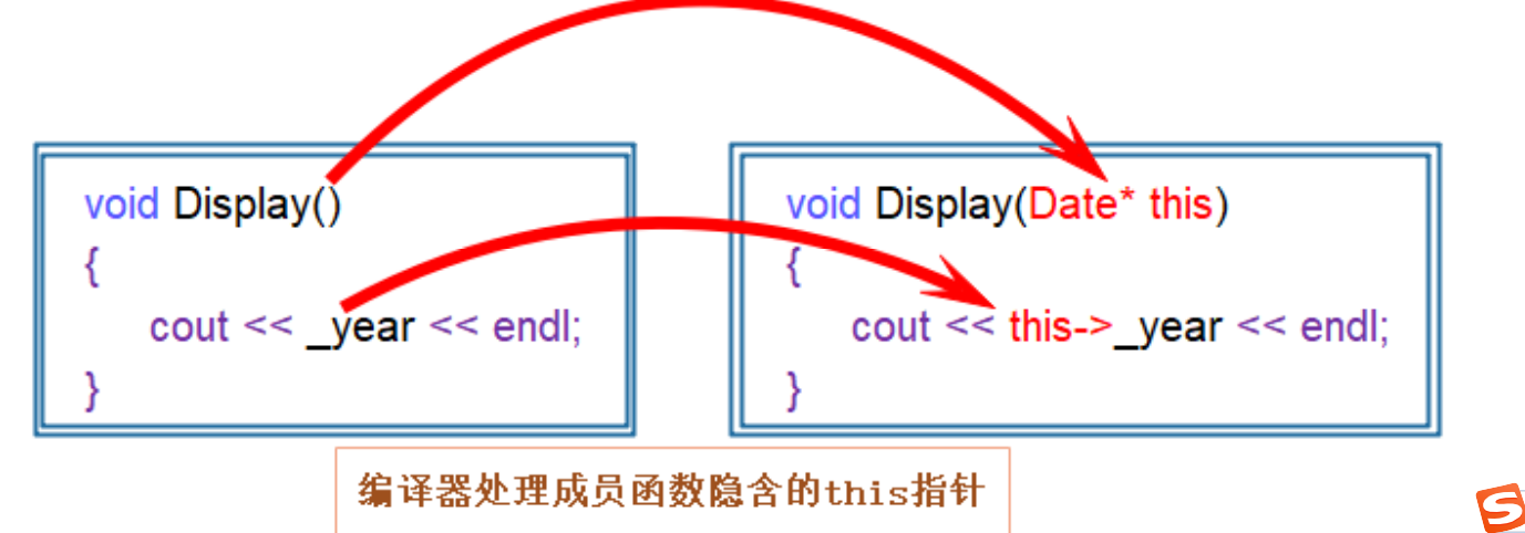 }我们来思考这么一个问题: Date类中有 Init 与 Print 两个成员函数,函数体中没有关于不同对象的区分,也就是说,d1和d2调用的是同一个函数,那当d1调用 Init 函数时,该函数是如何知道应该设置d1对象,而不是设置d2对象呢