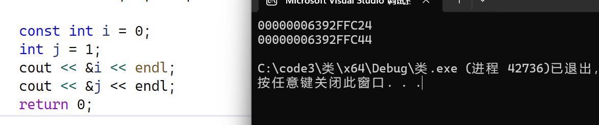 cout << &j << endl;c++中,const定义的变量是存储在栈中的,我们可以打印它们的地址: