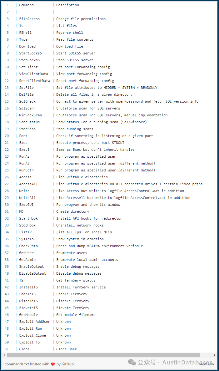 Maggie命令 对恶意软件的分析表明,它伪装成一个名为"sqlmaggieAntiVirus_64.dll"的扩展存储过程DLL文件,该文件由DEEPSoft Co. Ltd数字签名,这家公司似乎位于韩国。扩展存储过程文件通过使用接受远程用户参数并以非结构化数据响应的API扩展SQL查询的功能。Maggie利用这种技术行为,通过一个包含51个命令的丰富设置来实现远程后门访问。