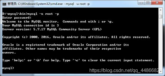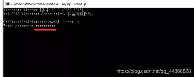 10.服务启动成功之后,就可以登录了,如图,输入mysql -u root -p(第一次登录没有密码,直接按回车过),登录成功!