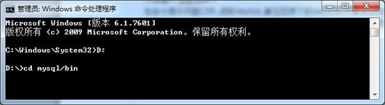 6.以管理员身份运行cmd(一定要用管理员身份运行,不然权限不够),具体方法是:右击命令提示符窗口,选择“以管理员身份运行”。然后在命令提示符窗口中,进到MySQL解压目录下的bin文件(不管有没有配置过环境变量,也要进入bin文件夹,否则之后启动服务仍然会报错误):具体方法是:这里以D盘下的路径为例: 输入:D: cd MySQL\bin
