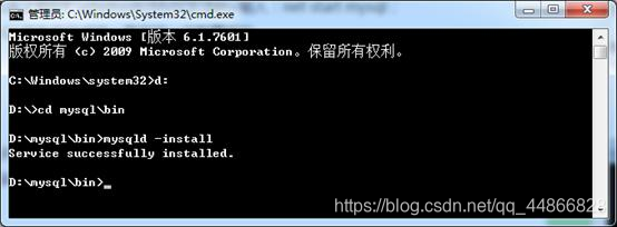 8.安装MySQL,具体方法是:在之前的D:\MySQL\bin>后输入:mysqld –install