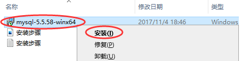 1.下载 2.建一个英文路径的文件夹用来安装数据库 3、鼠标右击 mysql-5.5.58-winx64,选择 安装