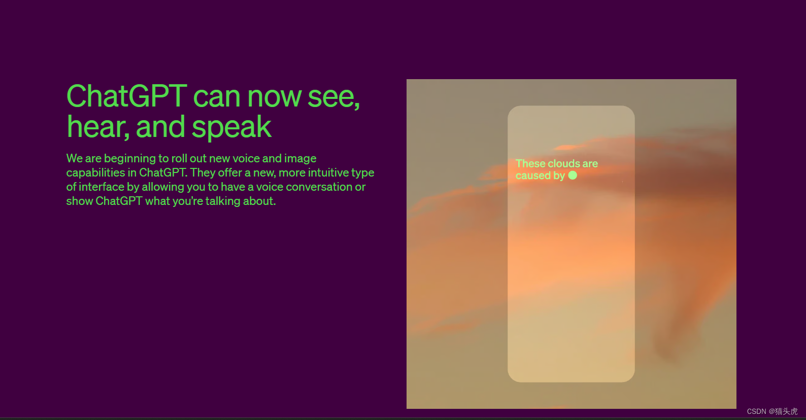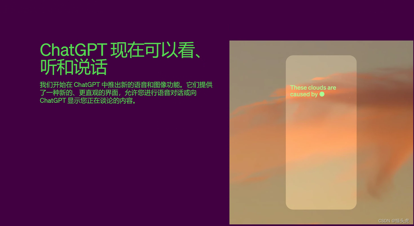 大家好,我是猫头虎博主🐯,今天我要带领大家了解一下,OpenAI的 #ChatGPT 刚刚更新了一些令人兴奋的视听功能!🎉 这些新增功能将使我们能够通过语音和图像与ChatGPT交流,让交互变得更为直观和生动。现在,让我们一起探究一下这些新功能吧!