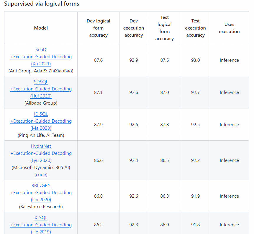 2017年9月,Salesforce提出的一个大型的Text-to-SQL数据集,数据来源于Wikipedia,属于单领域,包含了80654个自然语言问题,77840个SQL语句,SQL语句形式比较简单,不包含排序、分组、子查询等复杂操作。包含了 24,241张表,80,645条自然语言问句及相应的SQL语句。由于该数据集的sql形式简单,不支持多列选择,or、group by、order by、limit等操作,而且只支持单表操作,所以相对而言任务比较简单,目前学术界的预测准确率最高可达93%+。