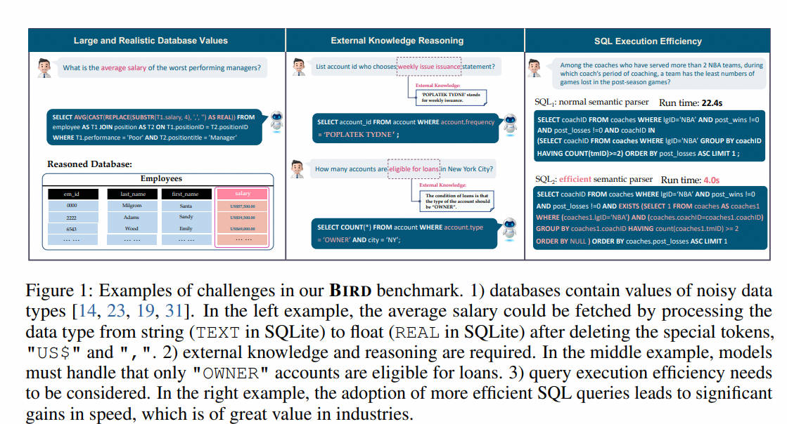 2021年8月,西安交通大学和微软等提出了首个跨领域、多轮Text-to-SQL中文数据集,包含了5459个多轮问题组成的列表,17940个<query, SQL>二元组。 BIRD-SQL [paper ] [code ] [dataset ]
