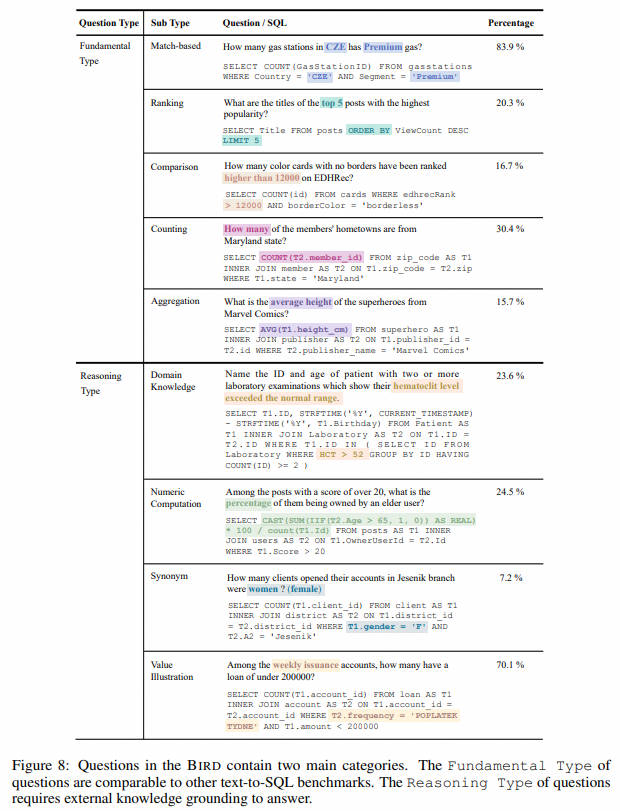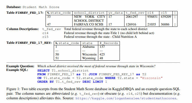 2023年5月,香港大学和阿里巴巴提出了一个大规模跨域数据集BIRD,其中包含超过12751个独特的问题 SQL、95个大数据库,总大小为33.4GB。它还涵盖区块链、曲棍球、医疗保健和教育等超过37个专业领域。 KaggleDBQA [paper ] [code ] [dataset ]