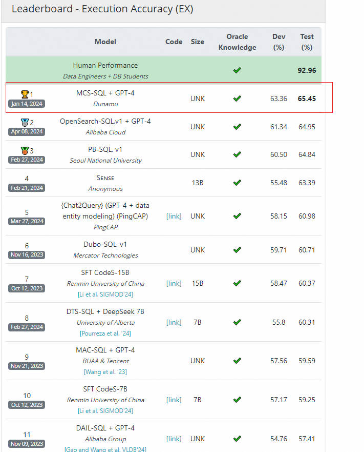 2021年6月,华盛顿大学和微软研究院提出了KaggleDBQA,这是一个真实Web数据库的跨域评估数据集,具有特定领域的数据类型、原始格式和不受限制的问题。 它包括跨 8 个数据库的 272 个示例,每个数据库平均有 2.25 个表。 该数据集以其真实世界的数据源、自然的问题创作环境以及具有丰富领域知识的数据库文档而闻名。 主要统计数据:8.7% WHERE 子句、73.5% VAL、24.6% SELECT 和 6.8% NON-SELECT。 2.2 在Spider 和BIRD榜单情况 Spider 1.0与大多数先前的语义解析任务不同,因为:ATIS、Geo、Academic:它们各自仅包含一个数据库,SQL查询数量有限,且训练和测试集中SQL查询完全相同。WikiSQL:SQL查询和表的数量显著增多。但所有SQL查询都很简单,每个数据库仅是单一表,没有外键。Spider 1.0在图中占据最大面积,是首个复杂且跨领域的语义解析和文本到SQL数据集!