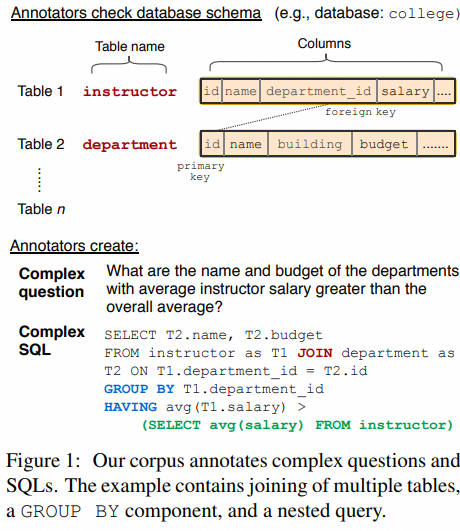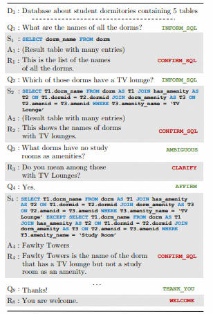 2019年9月,西湖大学提出了一个大型中文数据集CSpider,用于复杂和跨领域的语义解析和Text-to-SQL任务,由2位NLP研究人员和1位计算机专业学生从数据集Spider翻译而来,其中包含200个数据库上的10181个问题和5693个独特的复杂SQL查询,具有涵盖138个不同领域的多个表的数据库。 CoSQL [paper ] [code ] [dataset ]