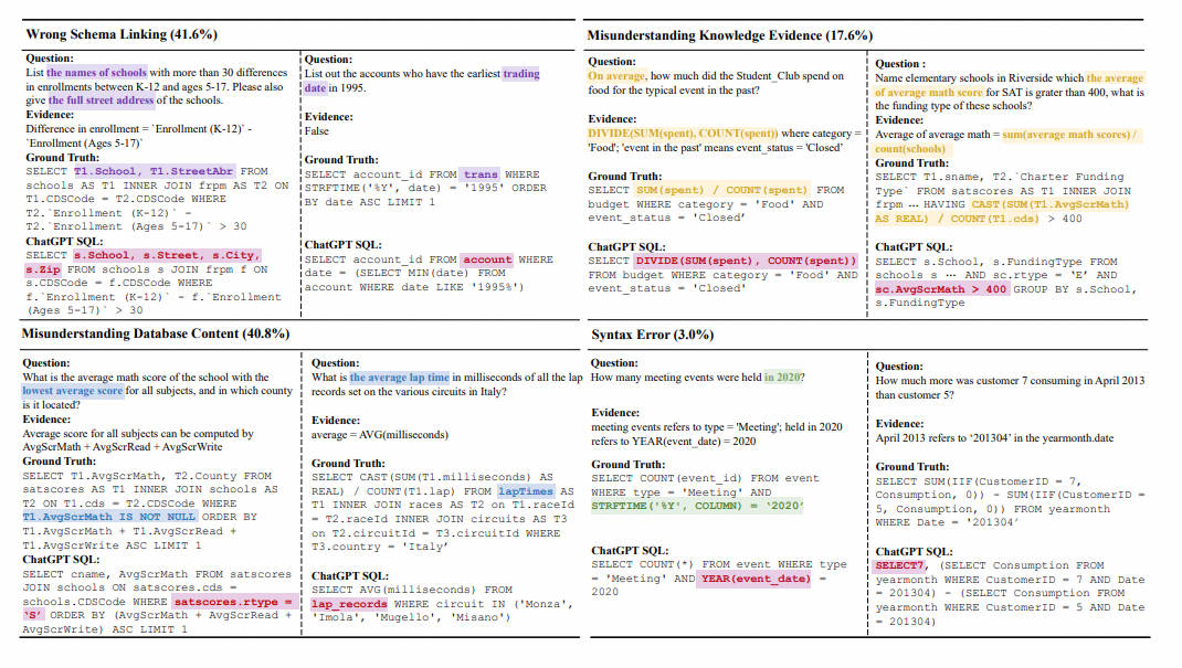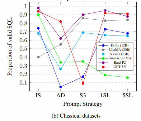 附加数据库示例行是无效的:就像使用Spider数据集观察到的结果一样,S3 提示策略在应用于不同模型的经典数据集时会产生低于标准的结果。因此,很明显,S3 提示策略在 Text-to-SQL 环境中可能并不有效。