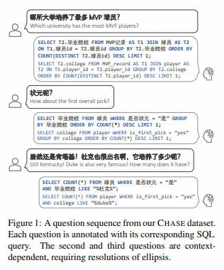 2020年11月,百度针对跨域文本到SQL任务提出了一个大规模、实用的中文数据集DuSQL,它包含200个数据库、813个表和23797个Question-SQL对。 CHASE [paper ] [code ] [dataset ]