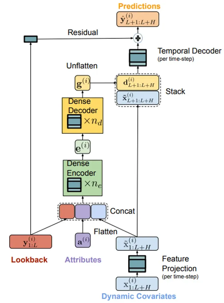 TiDE 是23年4月谷歌发布的的多变量时间序列模型,可以在预测时段使用静态协变量(例如产品的品牌)和已知或未知的动态协变量(例如产品的价格)来生成准确的预测。与Transformers的复杂架构不同,TiDE 基于一个简单的编码器-解码器架构,并使用了残差连接: