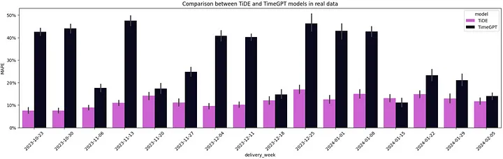 在16周的195个时间序列中,有15周TiDE的平均MAPE低于TimeGPT。TimeGPT的零样本学习能力并没有打败我们的微调模型,并且这个模型是23年4月发布的,到现在已经有将近1年的时间了。
