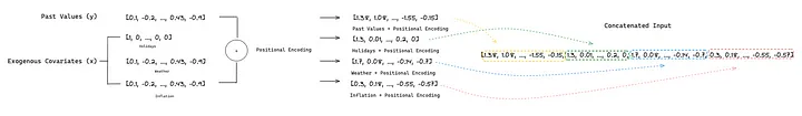 该模型接收历史值窗口(y)和外生协变量(x)作为输入。协变量可包括额外的时间序列数据和/或表示特定事件(如公共节假日)的二进制变量。通过整合本地位置嵌入,这些输入将得到序列信息的补充。这样,模型就能意识到时间依赖性。虽然作者没有明确说明,但我们认为所有输入都是在位置编码后进行串联的,从而产生最终输入,为编码器提供信息。