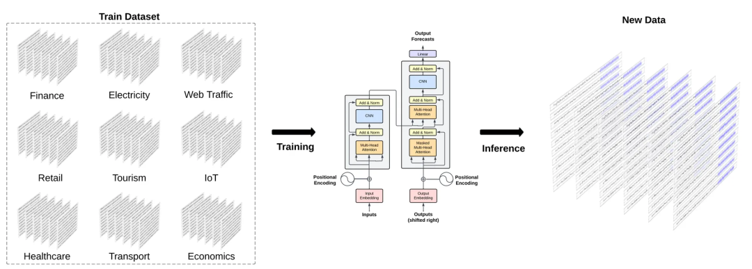 现在我们回到TimeGPT ,它号称利用迁移学习在零样本推理设置中表现出色。它使用了来自经济学、人口统计学、医疗保健、天气、物联网传感器数据、能源、网络流量、销售、交通和银行等各种领域的大量公开可用数据集,总共达到了1000亿个数据点。
