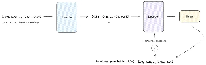 除处理编码器的输出外,解码器还以自动回归的方式运行。在生成后续时间步长(i+1)的预测之前,解码器会吸收之前生成的输出。解码器利用注意力机制捕捉编码器生成的隐藏状态与之前生成的输出之间的复杂关系。这种方法使解码器能够有效地将编码器表征中包含的上下文和顺序信息与自身的迭代预测进行综合。