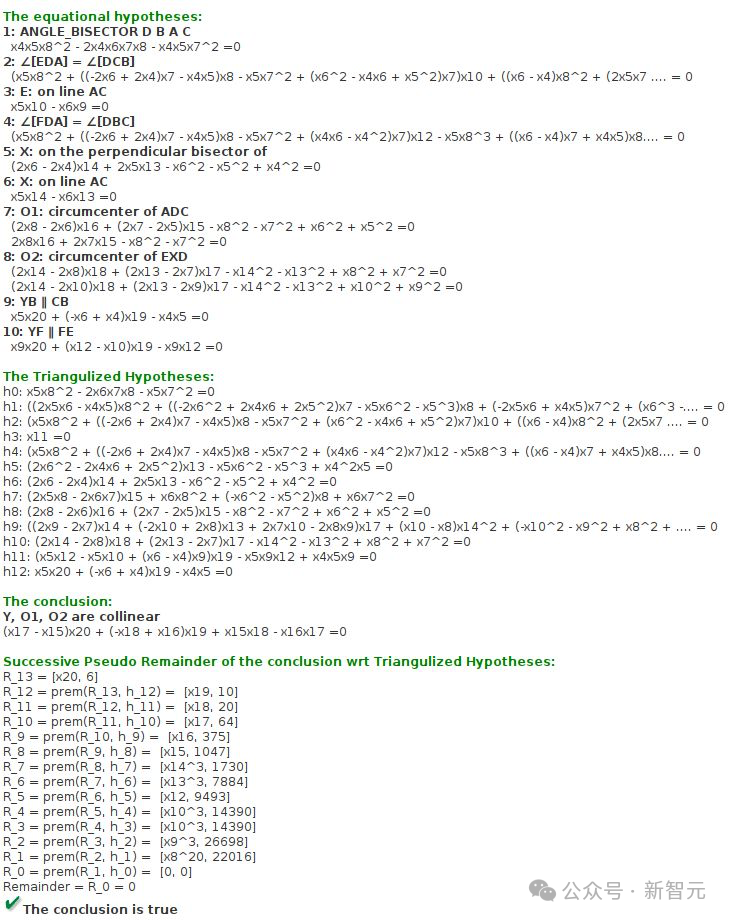 经过手动验证了自己翻译的几个问题,团队确认JGEX生成的假设和结论方程是正确的。