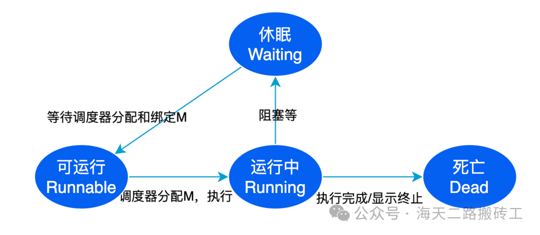 当G在执行过程中遇到会导致阻塞的操作时,它会从M上解绑并进入休眠状态,等待被唤醒。一旦阻塞的操作完成,G会变回可运行状态,并等待被调度器重新分配到M上执行。如果G完成了所有的工作,它就会进入死亡状态,等待垃圾回收。