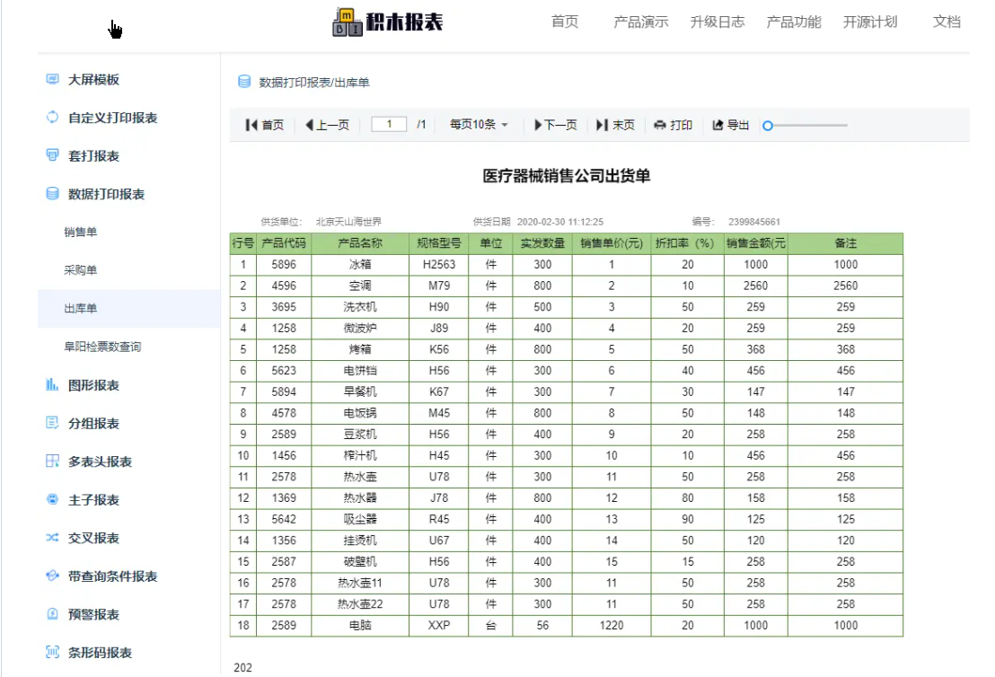 可设计各种类型的单据、大屏,如出入库单、销售单、财务报表、合同、监控大屏、旅游数据大屏等