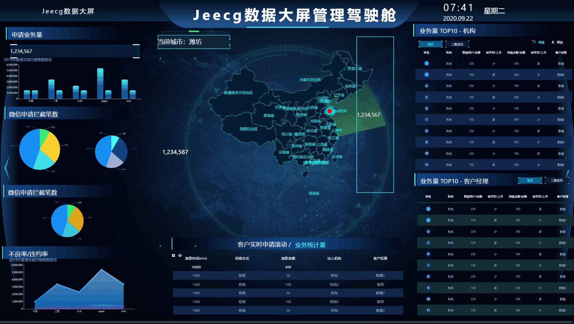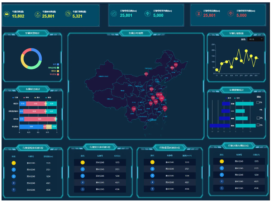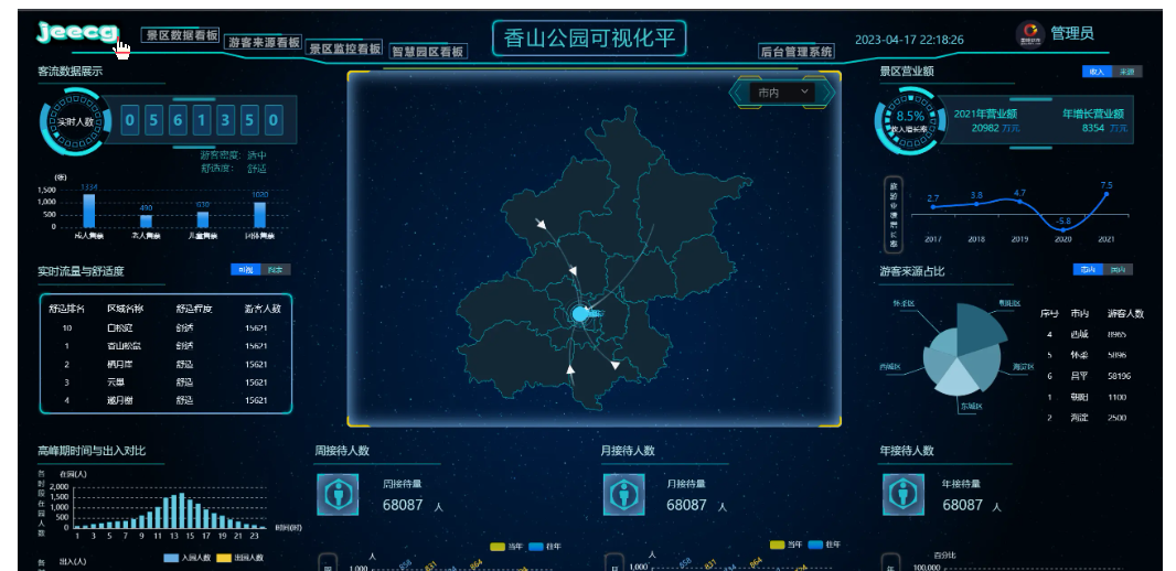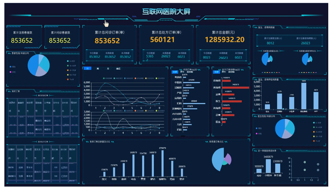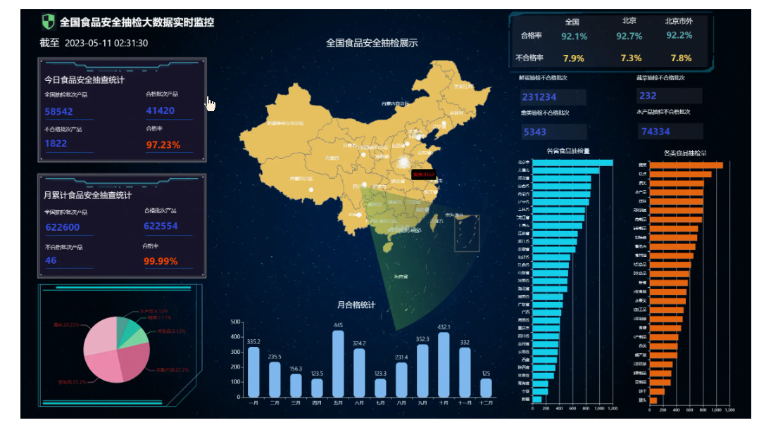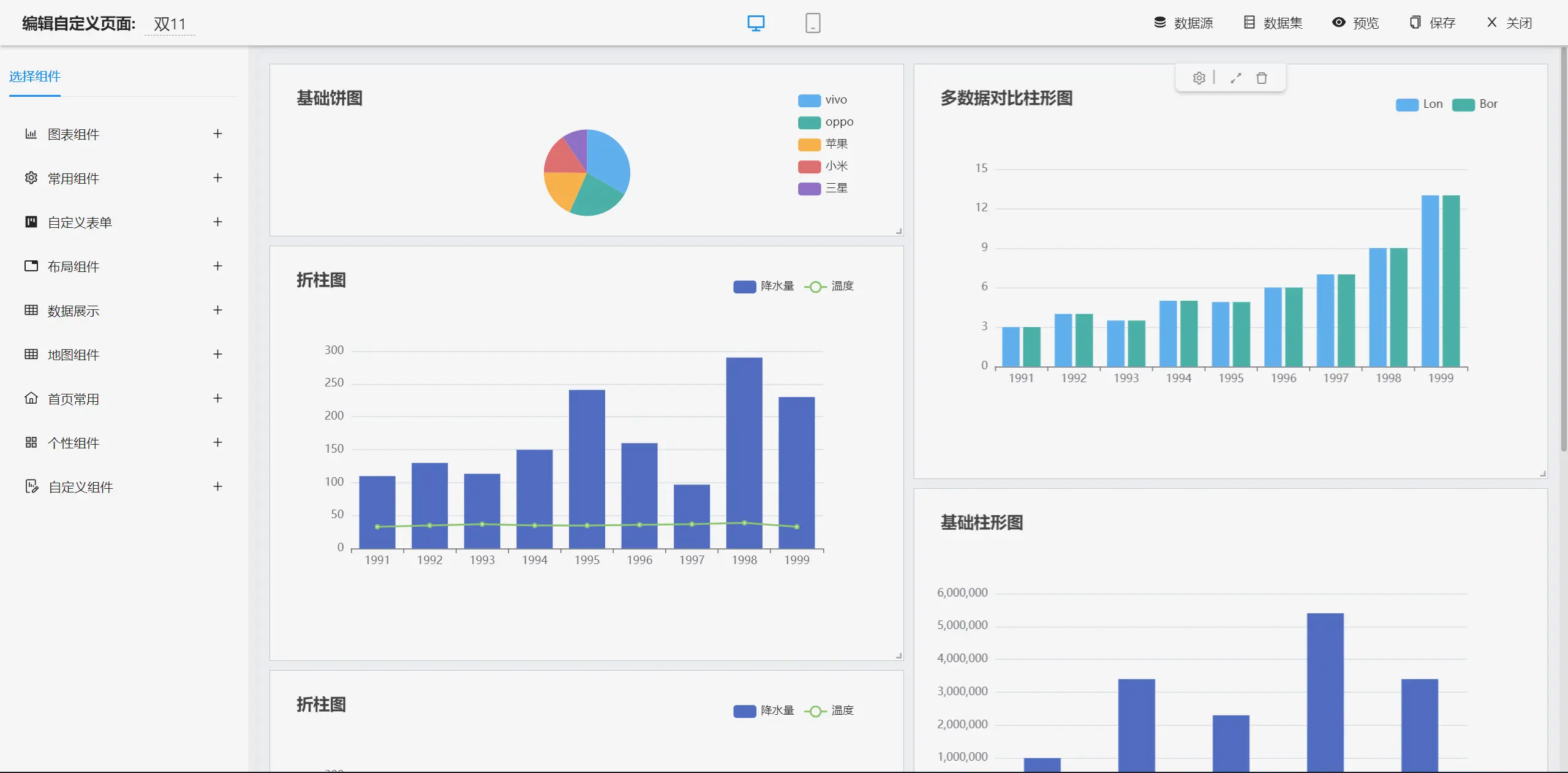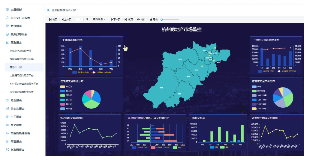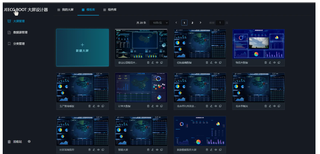 ```大屏设计器支持几十种图表样式,可自由拼接、组合,设计炫酷大屏