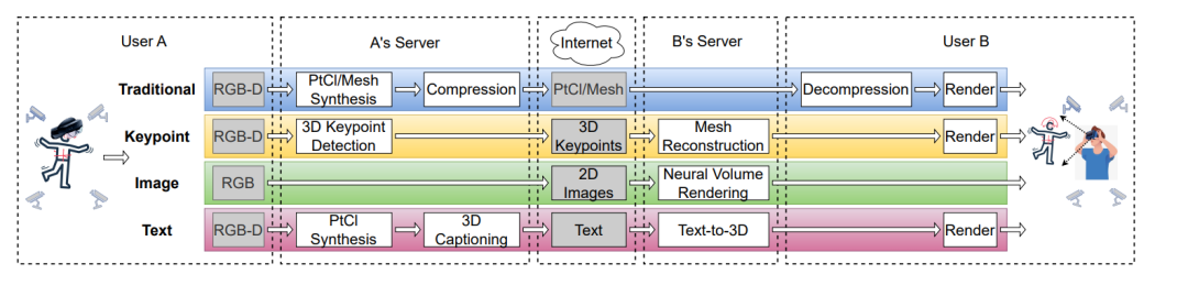 图 1:传统方法和三种基于语义的全息通信的端到端流程。为简单起见,我们仅展示从A到B的通信过程,从B到A的过程镜像了这个结构。(PtCl:点云)