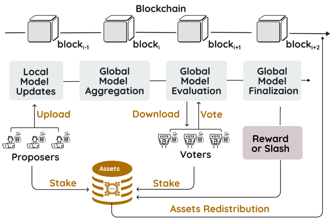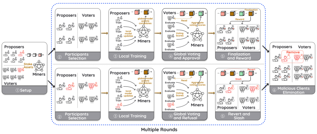 每一轮 FL 训练中,参与者将被随机选中参与两种类型的行动,提议(上传本地更新)和投票。聚合者(可以是区块链矿工或者其他 FL 链下聚合者)将对收到的本地更新进行聚合从而得到全局聚合。如果大多数投票接受全局聚合,提议者将退还其抵押的代币,而投票接受的投票者不仅会退还,而且还会获得投票拒绝的投票者的抵押代币的奖励,反之亦然。