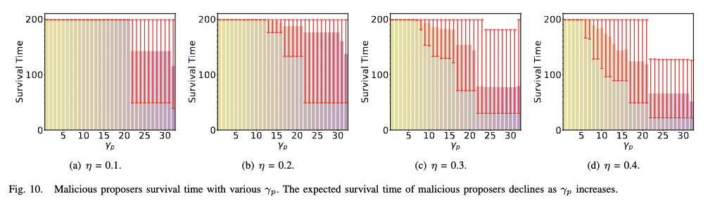 诚实参与者的存活时间:FLock 的实验结果也指出,在恶意节点占比较多的时候(即 \eta 增大时),较大的惩罚力度也会造成部分诚实节点的存活时间缩短(因为每一轮的提议者和投票者是随机选取的)。因此,在实际应用中,要结合考虑恶意节点占比(即 \eta)设置惩罚力度(即 \gamma)。