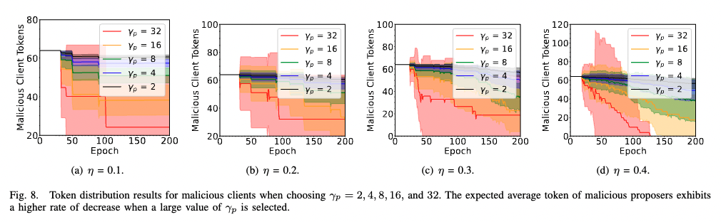 恶意参与者的抵押代币变化:同理论分析一致,恶意参与者的平均代币随着训练轮数 / 时间的增加而减少。并且,如果惩罚力度增大(即 \gamma 增大),则恶意参与者的平均代币的减少速度将会增大。