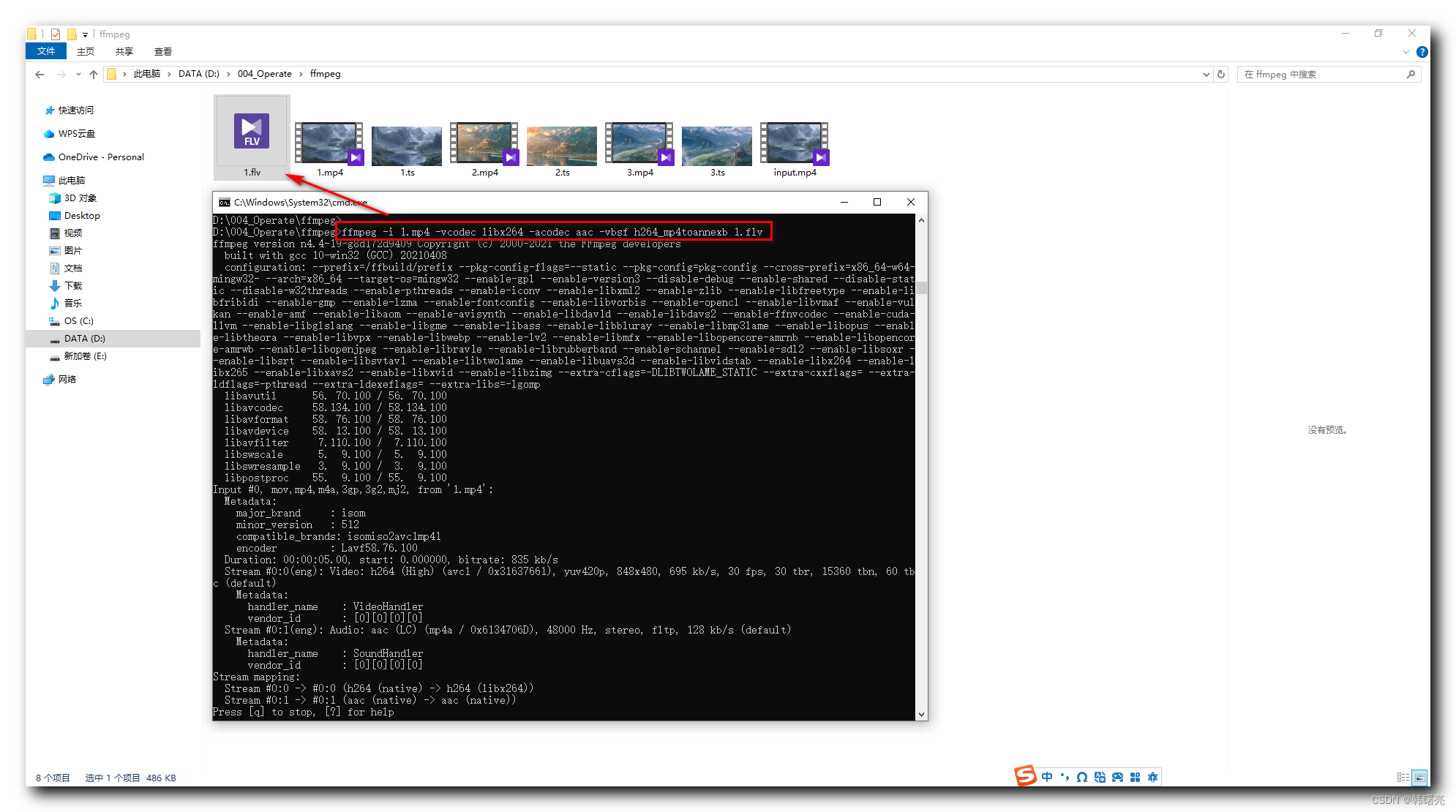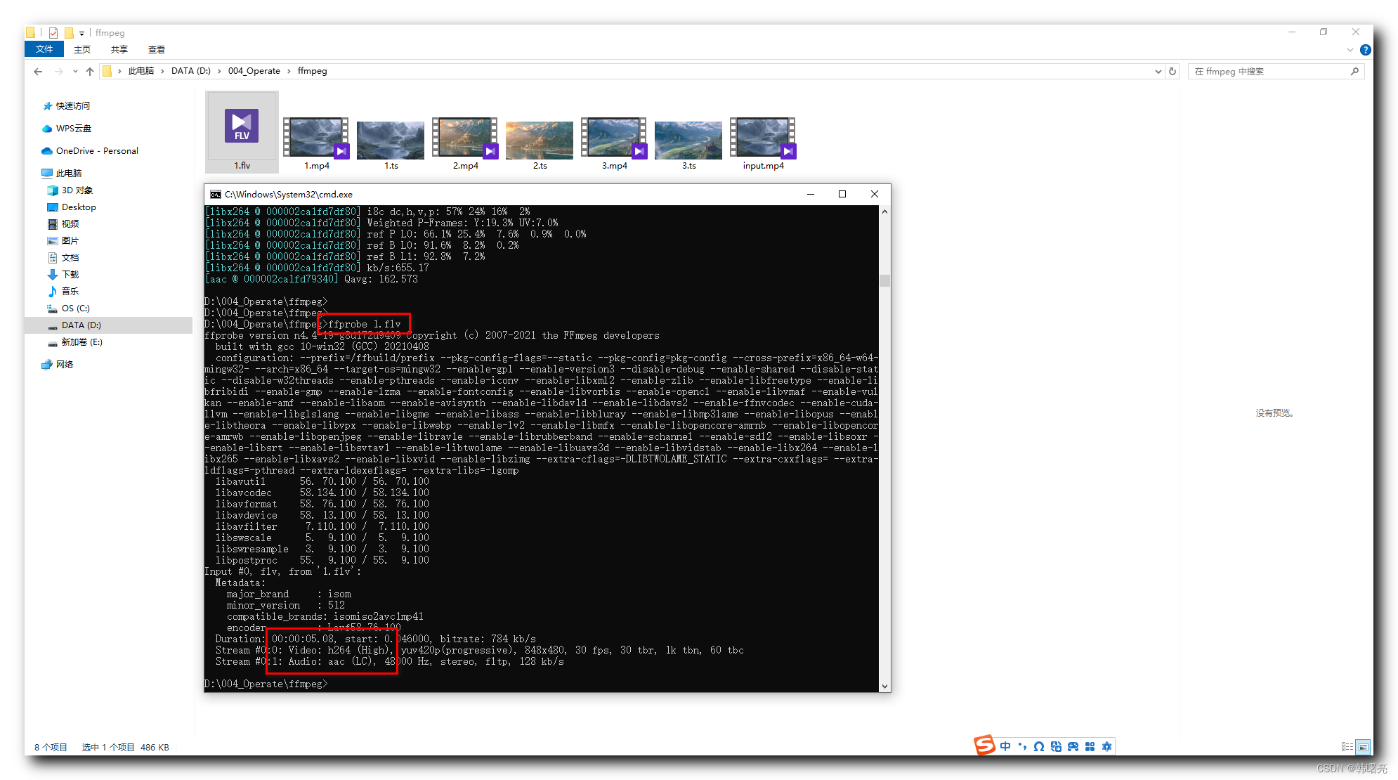 ffprobe 1.flv命令 , 查看 转换后的 1.flv 输出文件 ;