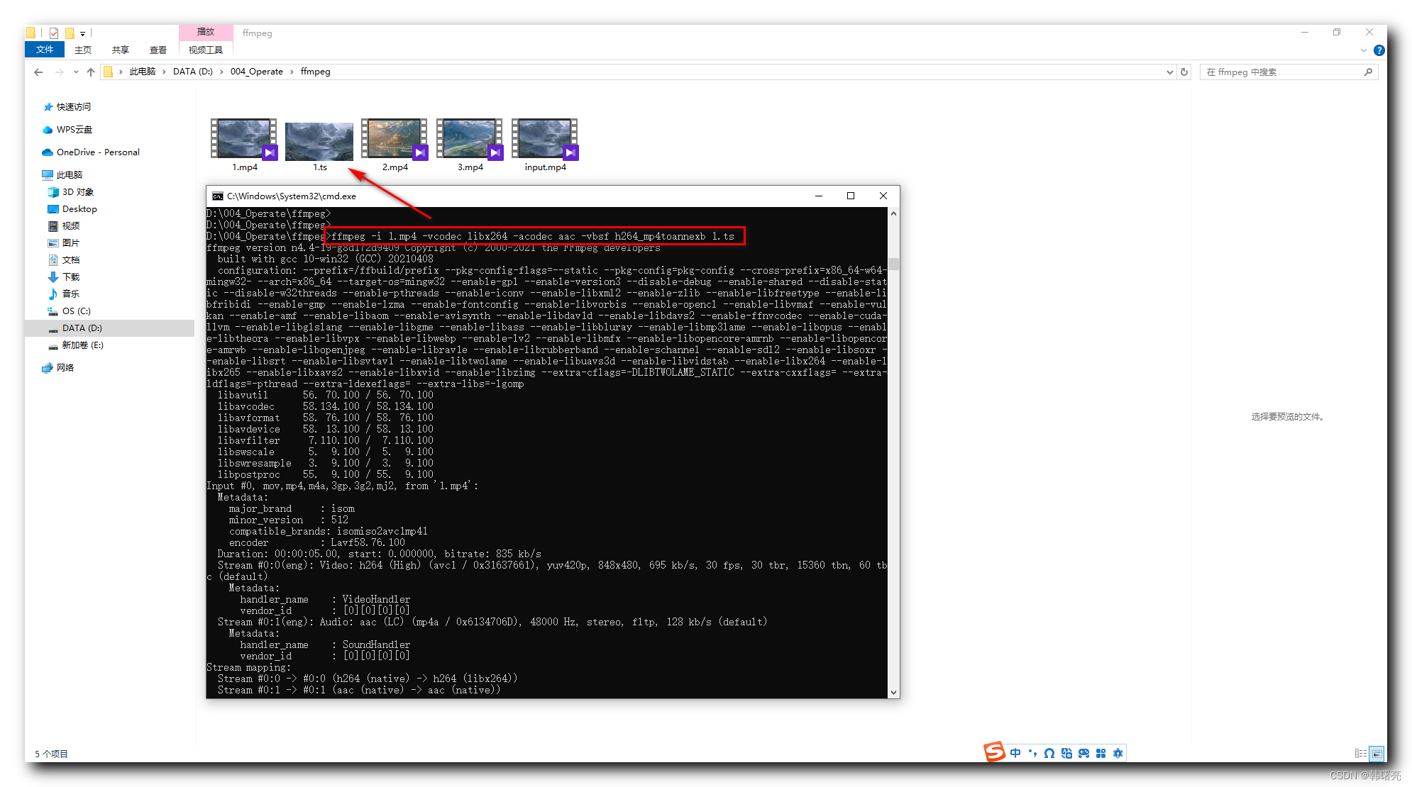 ffmpeg -i 3.mp4 -vcodec libx264 -acodec aac -vbsf h264_mp4toannexb 3.ts将 裁剪出的 3 个 mp4 格式的 视频 , 转为 ts 格式的视频 ;
