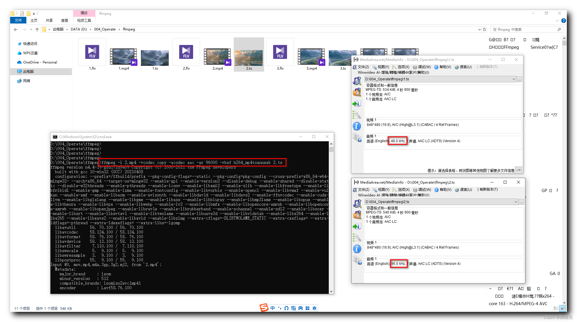 ffmpeg -i 2.mp4 -vcodec copy -acodec aac -ar 96000 -vbsf h264_mp4toannexb 2.ts命令 , 将 2.mp4 的 视频编码不变 , 音频编码不变 , 但是音频的采样率改为 96000 Hz ;