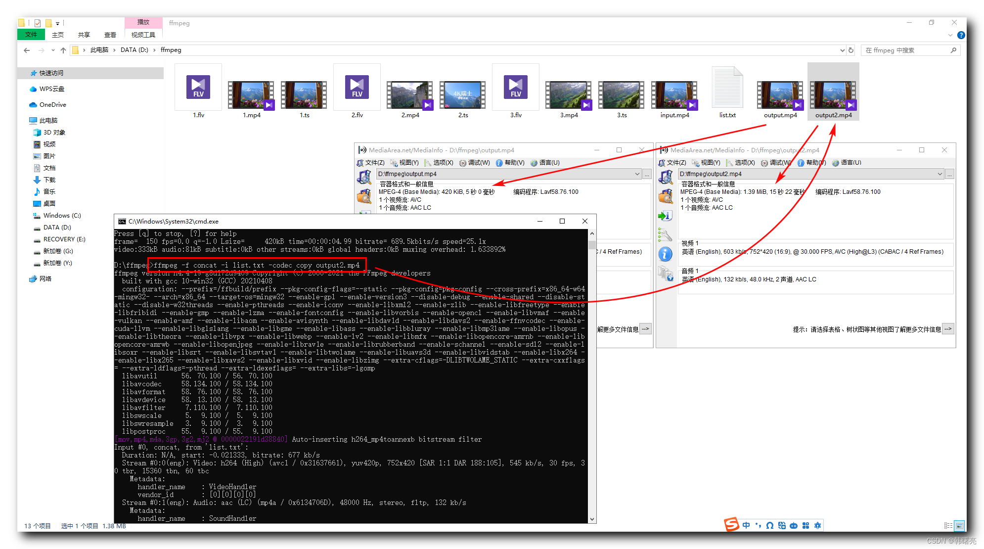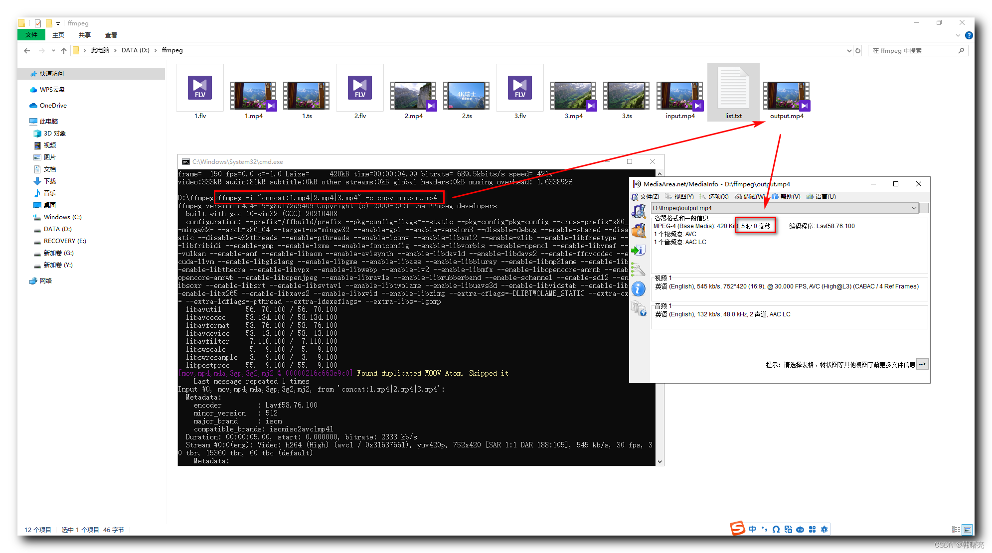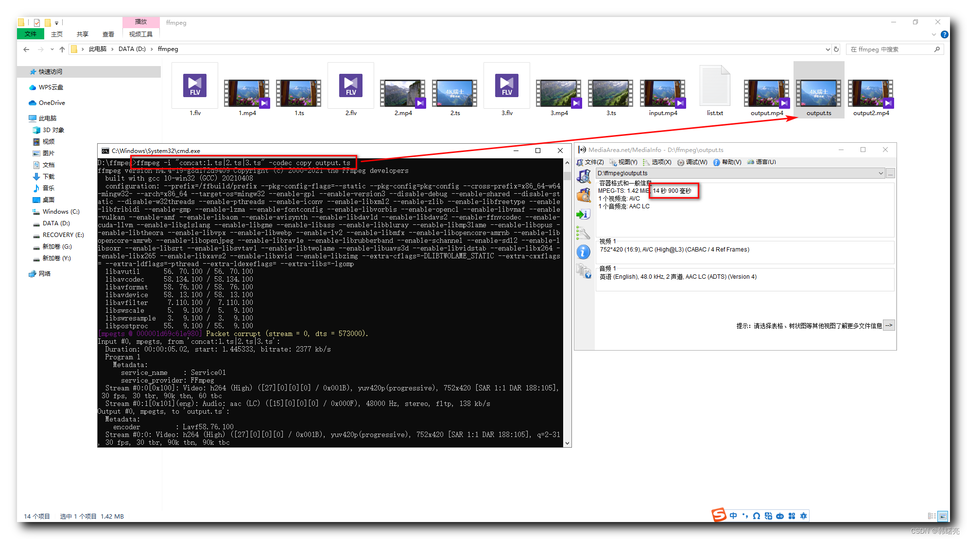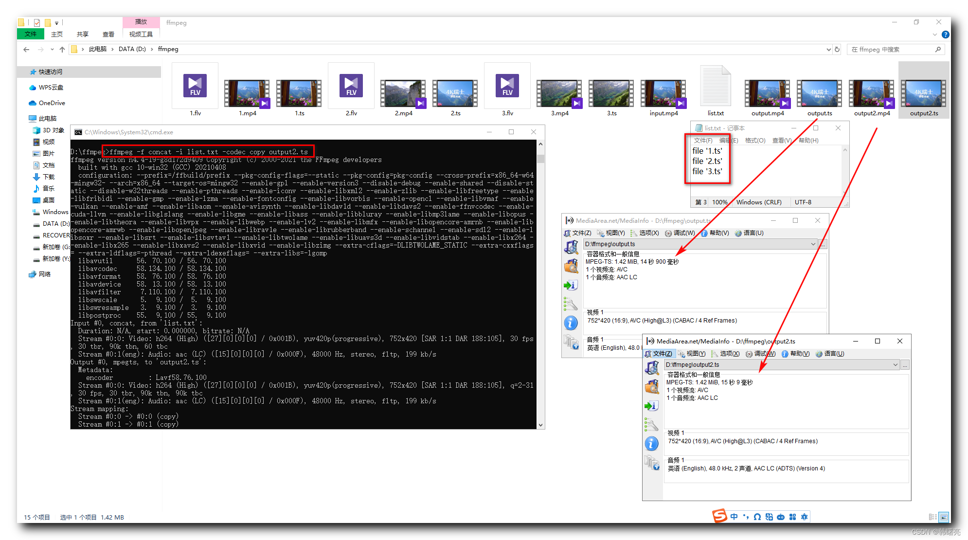 ffmpeg -f concat -i list.txt -codec copy output2.ts命令 , 成功拼接视频 , 视频播放效果也很好 ;