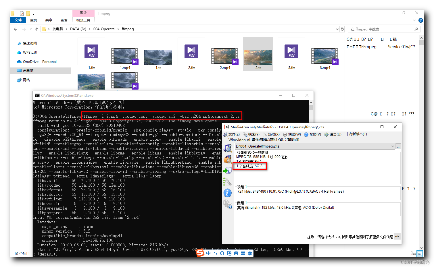 ffmpeg -i 2.mp4 -vcodec copy -acodec ac3 -vbsf h264_mp4toannexb 2.ts命令 , 将 2.mp4 的 视频编码不变 , 音频编码 由 aac 改为 ac3 编码 , 此时 2.ts 的音频编码 与 1.ts 和 3.ts 的 aac 格式音频编码 不同 ;